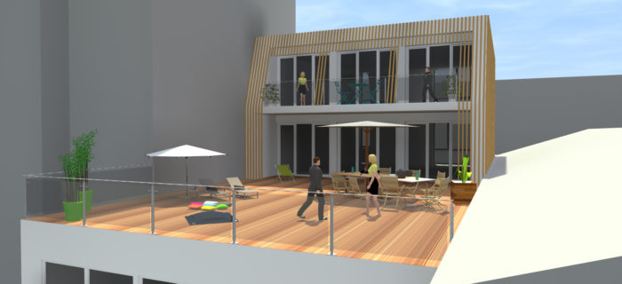 Le RDC est conçu comme un soubassement desservant les bureaux existants, le parking existant en sous-sol ainsi que le hall pour les logements neufs. Le volume de l’extension est recouvert d’un bardage bois à tasseaux, se retournant sur le pignon. Deux percements – une large baie toute hauteur pour les pièces de vie, ainsi qu’un seconde baie plus fine éclairant des chambres – opèrent comme une réinterprétation contemporaine du chien assis traditionnel. La façade jardin est quant-à-elle entiérement ouverte sur une grande terrasse bois.